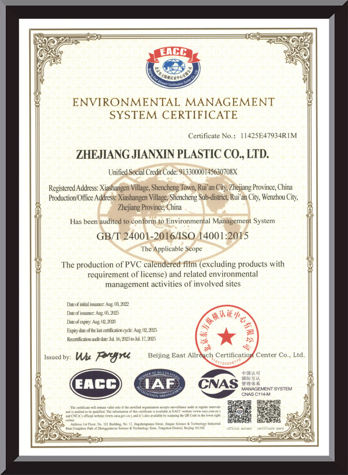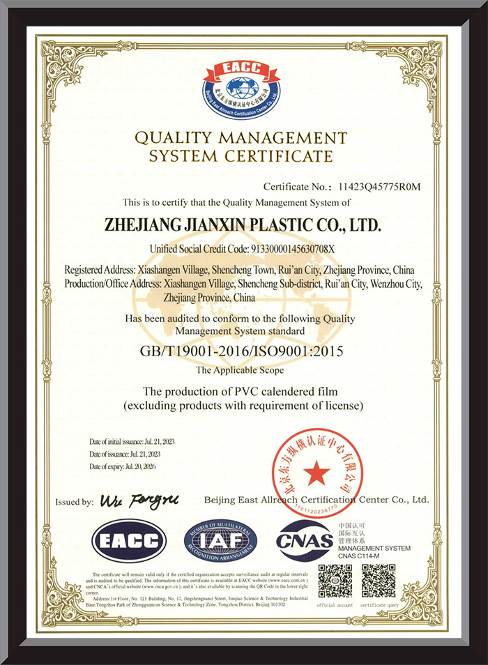 The company was formerly known as Ruian Jianxin Plastic Film Factory, which was founded in 1992. It is a private joint-stock company specializing in the production of PVC calendered plastic film. Our company specializes in the production of PVC calendered film products, mainly including: European and American environmental protection standard films, transparent packaging films, cold-proof, high-temperature resistant, UV-proof, anti-static, flame retardant, scratch-resistant, weather-resistant, fantasy color, raincoat film, ribbon film, ID film, toy film, polymer car cover, cabinet semi-rigid decorative materials, etc.